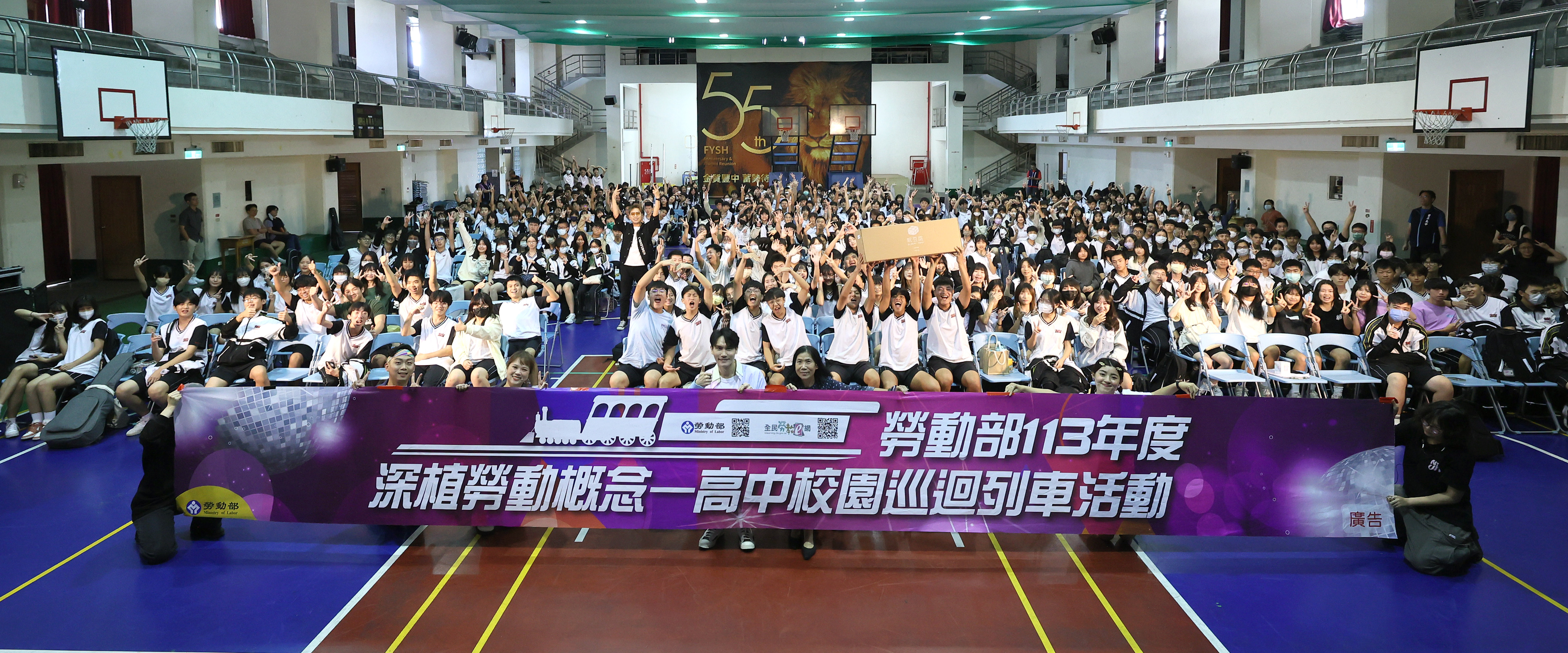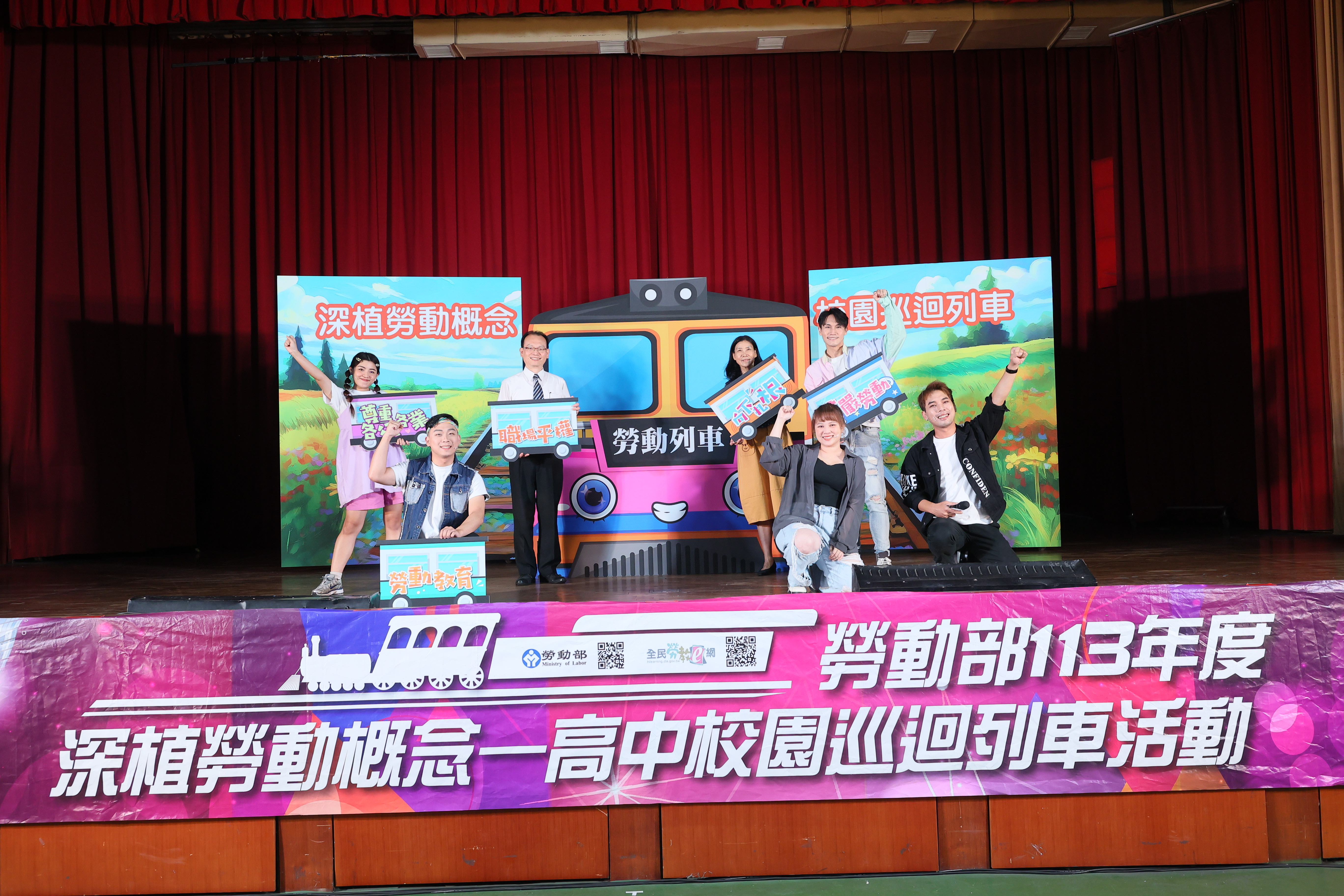 勞動部今(4)日於臺中市豐原高級中等學校舉辦「113年度深植勞動概念─校園巡迴列車活動」啟動儀式,由勞動部莊美娟專門委員、該校廖敏樂校長及知名歌手周定緯,一同參與啟動儀式,向青年學子宣傳正確勞動觀念。