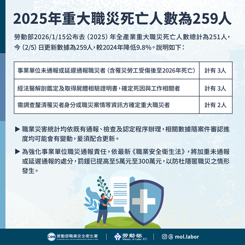 勞動部日前公布全國各縣市政府重大職業災害死亡人數統計,原公布死亡人數為251人,現更新為259人,較113年降低9.8%。原統計係依當時已完成通報及認定程序之案件彙整而成,惟部分案件陸續完成檢查程序及必要查核作業,或已取得解剖鑑定報告書,故相關統計數據配合更新,以精確呈現統計資料供社會大眾監督。