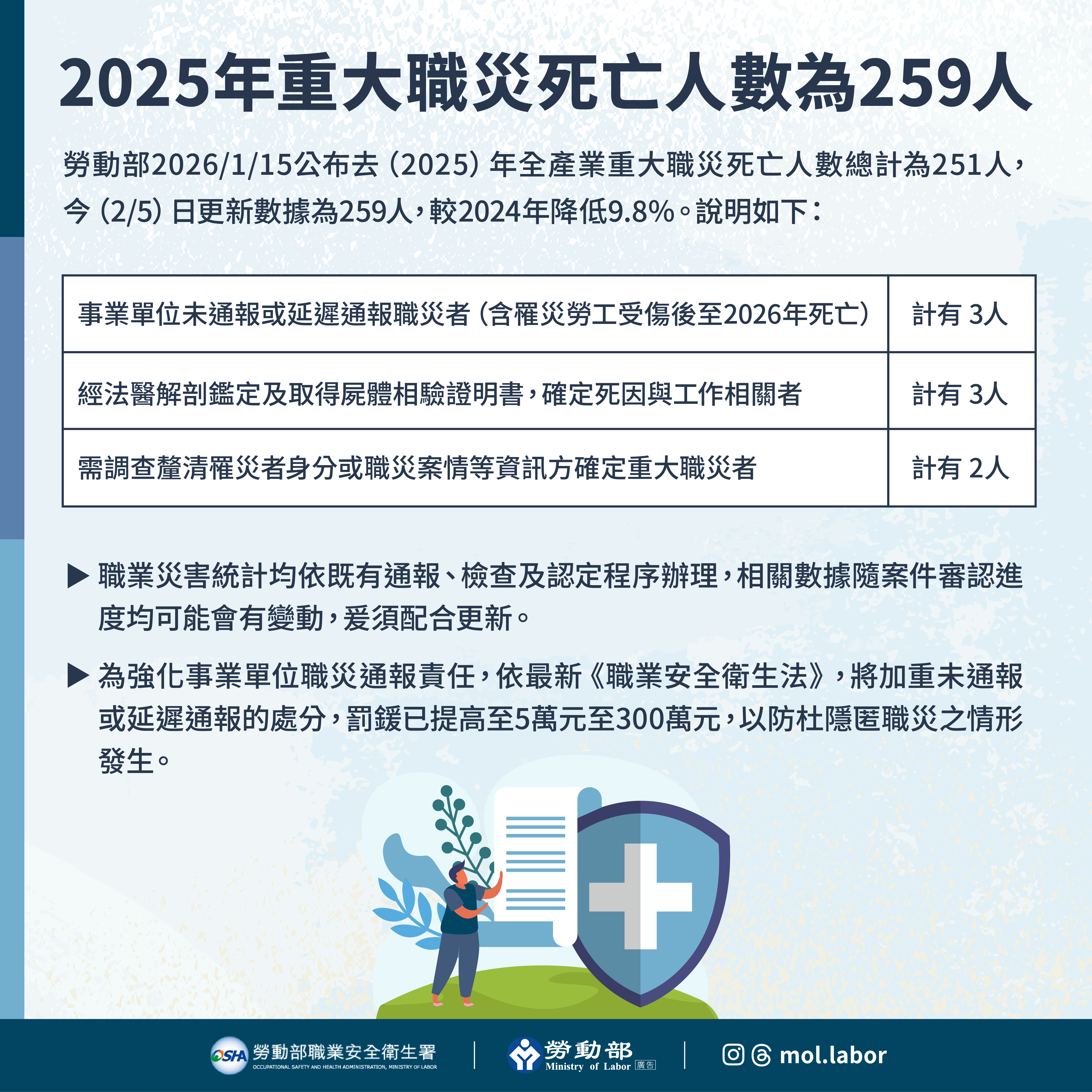 勞動部補充說明,職業災害統計均依既有通報、檢查及認定程序辦理,相關數據隨案件審認進度均可能會有變動,爰須配合更新。另為強化事業單位職災通報責任,依114年12月19日修正公布之職業安全衛生法規定,將加重未通報或延遲通報之處分,罰鍰由3萬元至30萬元提高至5萬元至300萬元,以防杜隱匿職災之情形發生;同時,也已要求各勞動檢查機構於接獲職災通報後應依規定儘速完成系統登錄及處理確認,以利勞動部即時掌握重大職災案件之發生及檢查處理情形,除定期對外公布讓公眾監督外,並適時檢視相應之減災策略俾滾動調整。未來各季統計資料,並將定期於該季結束後一個月於職安署官網-熱門連結之「職場重大職災/違法資訊公布專區」對外公布。