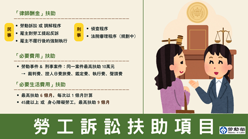 勞動部說明,為避免弱勢勞工在法律訴訟爭端中處於不利處境,勞動部持續滾動檢討勞工面對訴訟上仍需協助之處,已於114年擴大扶助範圍,將「經勞動主管機關調解成立後,雇主未履行調解內容而聲請保全或強制執行」,以及「勞工作為反訴被告之爭議」納入扶助範圍;同時,考量中高齡、高齡與身心障礙勞工於勞資爭議發生後較不易穩定就業,一併延長訴訟期間生活費用扶助期間,由原定最長6個月調整為9個月。根據114年度統計顯示,該年度總計准予約3,400件律師代理扶助、227件約計220萬裁判費等訴訟費用扶助,並提供186人次約計300萬元之訴訟期間生活費用扶助,該年扶助人數及金額均較往年有相當成長,顯見相關修正確有助於經濟弱勢勞工之權益保障。