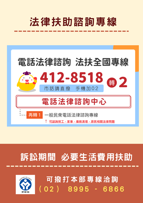 勞動部最後提醒,勞資爭議解決過程誠屬艱辛,然仍鼓勵勞工朋友應堅定維護自身合法權益。勞動部重申,相關法律扶助措施旨在提供弱勢勞工法律支持,雖不以興訟為目的,但絕不容許任何違反勞動法令、損害勞工權益之情事發生,勞動部將持續作為勞工爭取勞動權益之堅實後盾。勞工朋友如需律師代理或必要費用扶助,或就勞資爭議問題而有法律諮詢服務之需求,可撥打法扶基金會全國服務專線412-8518(市話可直撥;手機請加02);如欲瞭解訴訟期間必要生活費用扶助申請,可撥打勞動部專線02-89956866洽詢,以獲得完整、及時與正確之諮詢服務。