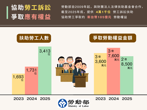 避免勞工怯於訴訟而喪失應有法定權益,勞動部自98年起與財團法人法律扶助基金會合作推動「勞工法律扶助專案」,且為貼近勞工朋友真實需求,每年都會依持續檢討、精進,整體受扶助勞工人數呈現穩定增長;從專案推動迄至去(114)年底止,已提供逾4萬1千6百餘位勞工訴訟扶助,近7成訴訟結果對勞工有利,已協助勞工爭取近新臺幣105億4千萬餘元之可得金額,成為勞工朋友訴訟過程中最有力的靠山。