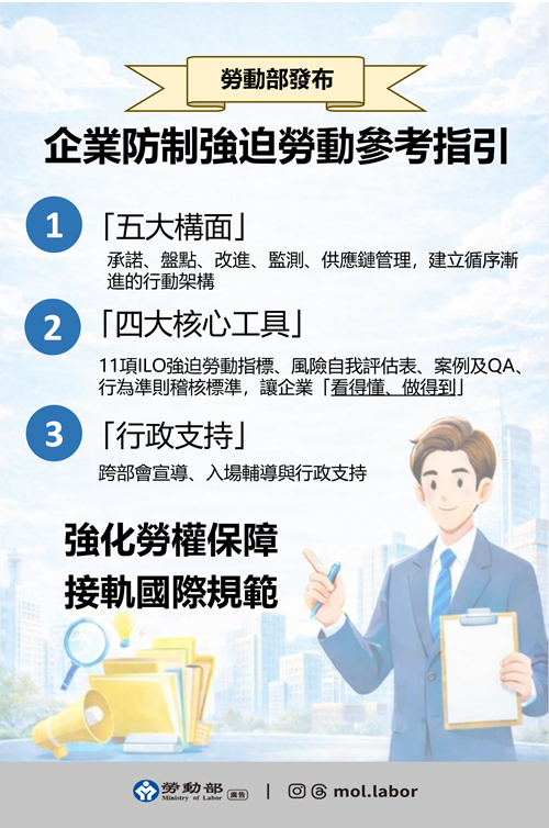 繼續閱讀更新日期:2026-02-25 附圖_勞動部發布企業防制強迫勞動參考指引 勞動部於今(115)年2月13日發布「企業防制強迫勞動參考指引」,因應國際供應鏈對防制強迫勞動及公平招募原則的重視,協助我國企