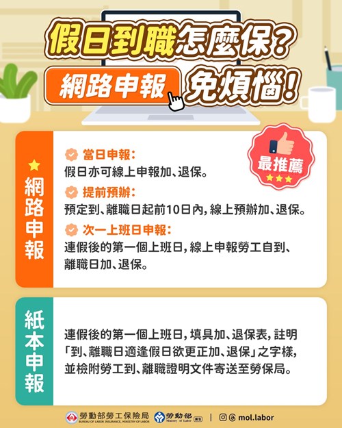 繼續閱讀更新日期:2026-02-10 附圖_假日到職怎麼保 春節假期即將到來,勞工如果在連假期間到職,投保單位該如何辦理勞工保險、就業保險及勞工職業災害保險之加保呢?別擔心!勞保局e化服務系統提供3種線上申